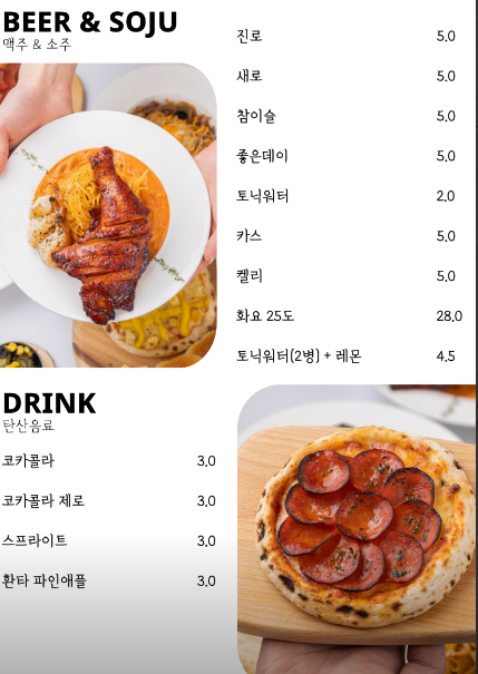 파스타는 10,900원부터 15,900원까지, 스테이크는 19,900원부터 29,900원까지 가격대가 다양합니다. 음료로는 에이드, 커피, 주스, 스무디 등이 준비되어 있으며, 주류도 판매하고 있습니다.