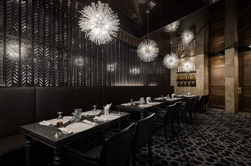 대리석 바닥과 브라운 톤의 원목 테이블 그리고 샹들리에 조명까지 어우러져 럭셔리한 분위기 물씬 풍겨요