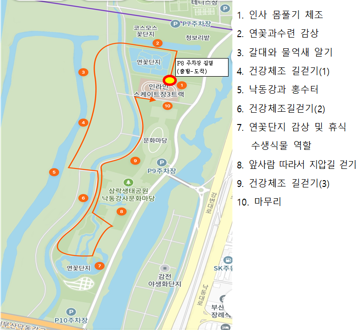 - 장소: 부산 낙동강 정원 내 연꽃정원 일원, 코스는 연꽃정원(P8번 주차장 주변)에서 시작하여 주변을 산책하고 탐방합니다.