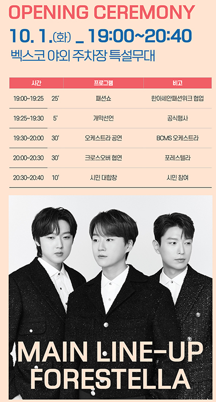개막식 참여하실 분은 사전 신청기간에 신청해야 합니다. 홈페이지에 회원가입 후 로그인 후 프로그램 - 시월통합개막식 페이지 클릭해서 신청합니다. 참고로 너무나도 멋진 포레스텔라가 온다고 합니다.