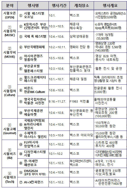 FESTIVAL SHIWOL, 페스티벌 시월, 부산국제영화제를 포함한 17개 국제행사들이 동시 개최되는 아시아 융복합 국제축제입니다.