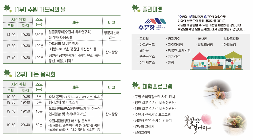 이번 행사는 수원수목원 개원 1주년을 기념하는 의미 있는 행사입니다. 정원 만들기, 꽃 심기 등의 체험 프로그램을 통해 시민들의 가드닝 관심을 높이고, 수원시립합창단의 공연으로 문화예술 향유의 장을 마련할 것입니다.