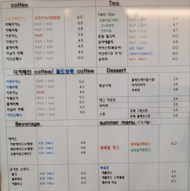 - 커피 메뉴: 아메리카노, 카페라떼, 카푸치노, 바닐라라떼 등 다양한 커피 메뉴를 제공합니다.