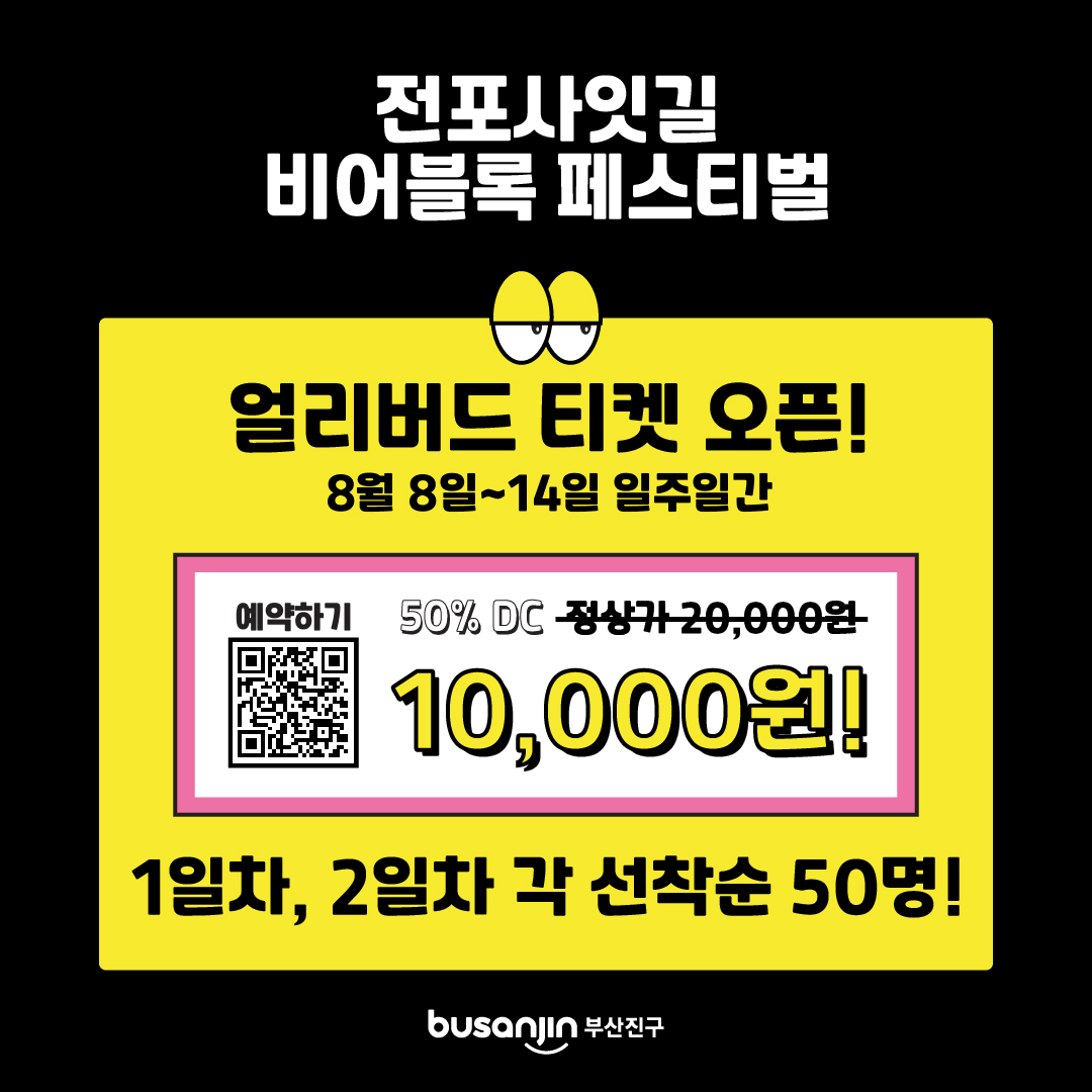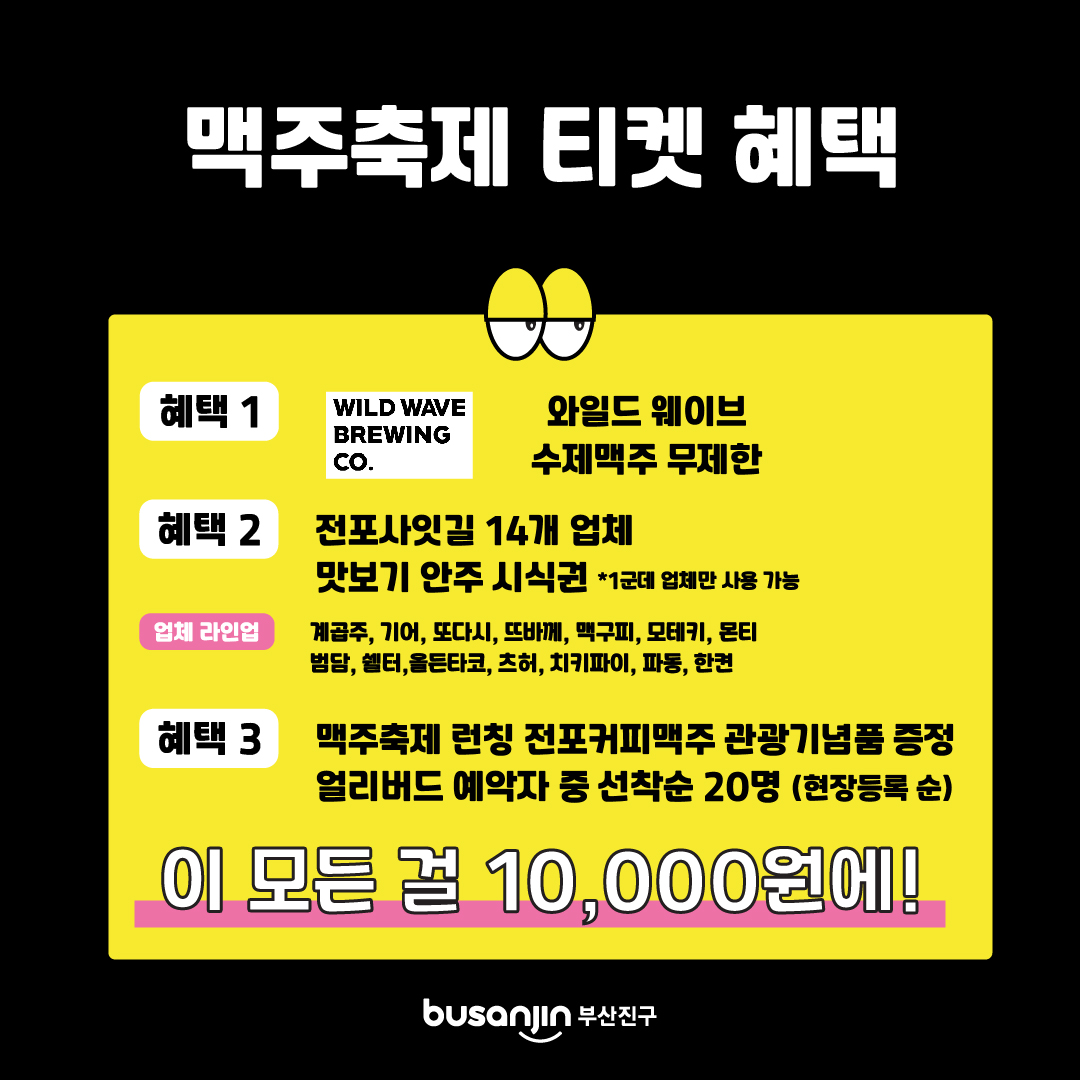- 핑거푸드 교환권: 티켓 구매 시 전포사잇길 내 14개 업체에서 사용할 수 있는 핑거푸드 교환권이 제공됩니다. 맛있는 음식과 함께 맥주를 더욱 즐겁게 즐길 수 있습니다.