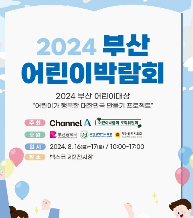 부산시에서는 2024년 8월 16일과 17일 양일간 벡스코 제2전시장에서 '2024 부산 어린이 박람회'를 개최합니다. 이번 박람회는 '아동이 가장 살기 좋은 도시 부산'이라는 주제로, 부산시가 추진하는 다양한 아동친화 정책을 소개하고, 아동의 권리와 안전, 그리고 건강한 성장을 위한 프로그램들을 선보일 예정입니다.
