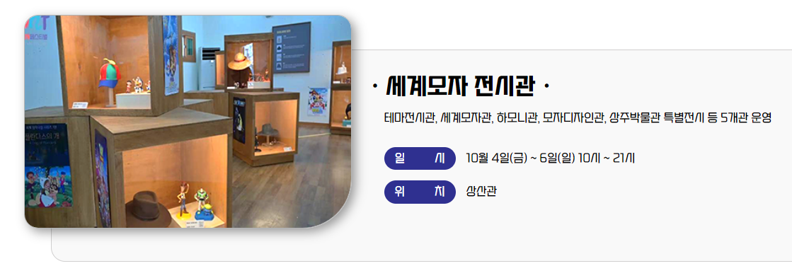 - 내용: 국내외 유명 모자 브랜드의 전시 및 판매